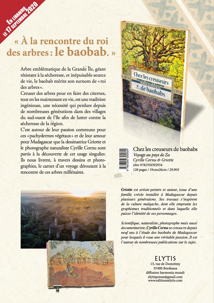 À travers 128 pages de textes, dessins et photographies, Chez les creuseurs de baobabs – Voyage au pays de Za invite ses lecteurs à découvrir une pratique aussi ingénieuse qu’unique en son genre : celle du creusage des baobabs pour en faire des citernes vivantes. Dans un village du sud-ouest malgache, cette tradition ancestrale permet de stocker l’eau de pluie dans le tronc des géants pluriséculaires.